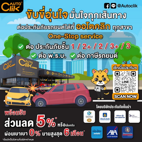 Premium Care บริการช่วยเหลือฉุกเฉิน 24 ชม. ราคาเพียง 995บาท/ปี ครอบคลุมทั่วไทย ทั้ง77จังหวัด บริการ รถยก/ลาก/สไลด์ ในระยะ 20 กม. แรก ฟรี! 1 ครั้งต่อปี บริการพ่วงแบตเตอรี่ ฟรี! ไม่จำกัดจำนวนครั้ง เปลี่ยนยางอะไหล่ ฟรี! ไม่จำกัดจำนวนครั้ง บริการนำส่งน้ำมัน ฟรี! 1 ครั้งต่อปี แจ้งเหตุด่วน SOS ตลอด 24 ชั่วโมง ผ่อนทั้งร้าน 0% นานสูงสุด 10 เดือน ออโตคลิก ได้ประกาศจัดแคมเปญพิเศษให้ลูกค้าประกันภัยปีต่อ เลือกรับส่วนลดพิเศษ 5% หรือผ่อนชำระในราคาเบาใจ 0% นานสูงสุด 6 เดือน สำหรับบริการแบบ “One-Stop Service” ของออโตคลิกที่จะช่วยให้ผู้ใช้รถยนต์สามารถต่อประกันภัยรถยนต์ รวมทั้งต่อพ.ร.บ. และภาษีรถยนต์ได้อย่างสะดวกสบายในที่เดียว