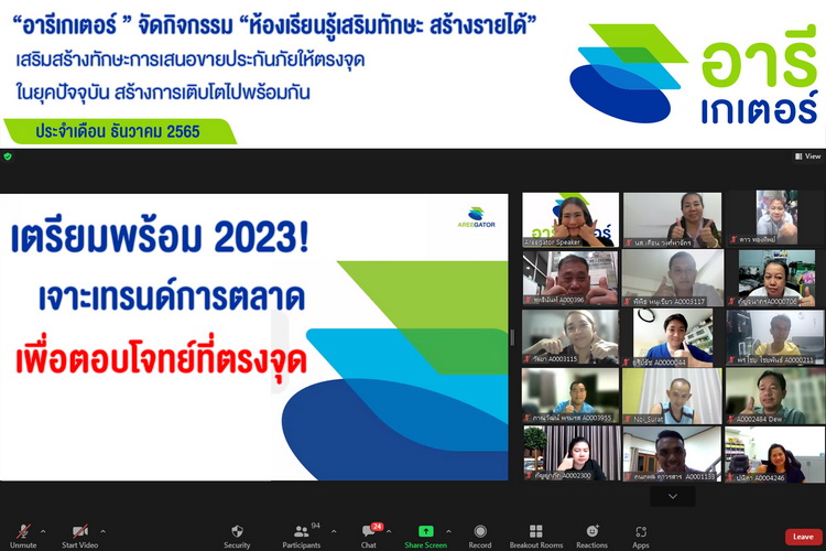 อารีเกเตอร์ (Areegator) แพลตฟอร์มเสนอขายประกันออนไลน์ ภายใต้คอนเซ็ปต์ “จริงใจ เข้าใจ เติบโตไปพร้อมกัน” โดย นายชาญฤทธิ์ สุกปลั่ง ผู้อำนวยการอาวุโส ฝ่ายวิเคราะห์และกลยุทธ์นายหน้าประกันภัย บมจ.เงินติดล้อ ส่งทีมงานจัดกิจกรรม “Areegator Monthly’s Classes ห้องเรียนรู้เสริมทักษะ สร้างรายได้” ประจำเดือน ธันวาคม 2565 โดยมีเนื้อหาเกี่ยวกับ “เตรียมพร้อม 2023 ! เจาะเทรนด์การตลาดเพื่อตอบโจทย์ที่ตรงจุด” เพื่อสร้างทักษะในการเสนอขายประกันให้ตรงความต้องการของกลุ่มเป้าหมายในปัจจุบันได้อย่างมีประสิทธิภาพ โดยกิจกรรมดังกล่าวได้รับความสนใจจากสมาชิกนายหน้าประกันภัย และนักขายอิสระเข้าร่วมการอบรมจำนวนมากกว่า 90 คน กิจกรรมดังกล่าวจัดขึ้นในรูปแบบออนไลน์ผ่านช่องทาง Zoom เมื่อเร็วๆ นี้ สำหรับนายหน้าประกันภัยหรือนักขายอิสระที่สนใจรับชมคลิปวีดีโอย้อนหลังได้ที่ Youtubeอารีเกเตอร์ หรือเยี่ยมชมข้อมูลอารีเกเตอร์ (Areegator) และสมัครสมาชิกโดยไม่มีค่าใช้จ่ายได้ที่ www.areegator.com และ Facebook อารีเกเตอร์ หรือ ติดต่อสอบถามรายละเอียดเพิ่มเติมได้ที่ Areegator call center หมายเลขโทรศัพท์ 02-792-1320 กด 2 (จ.-ศ. เวลา 08.30 – 17.30 น.)
