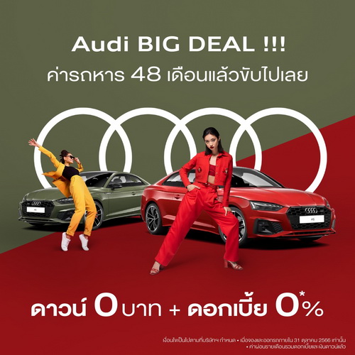 อาวดี้ จัดแคมเปญแรง ข้อเสนอสุดพิเศษ Audi BIG DEAL!!! ออกรถอาวดี้ตั้งแต่วันนี้จนถึง 31 ตุลาคมนี้ รับข้อเสนอ  ดาวน์ 0 บาท และดอกเบี้ย 0% นาน 4 ปี ไม่ต้องมีเงินดาวน์และไม่มีดอกเบี้ย ลูกค้าที่สนใจสามารถผ่อนชำระค่างวด โดยนำราคารถหาร 48 งวด ได้เลย  กองทัพยนตรกรรมอาวดี้รุ่นต่างๆ ที่เข้าร่วมแคมเปญพิเศษนี้ ประกอบด้วย A4 40 TFSI S line Icon Black, A5 Coupé 40 TFSI S line, A5 Sportback 40 TFSI S line, A5 Coupé 45 TFSI quattro S line Black Edition, A5  Sportback 45 TFSI quattro S line Black Edition, A7 Sportback 55 TFSI quattro S line, A8L 55 TFSI quattro Premuim, Q5 55 TFSI e quattro S line และ TT Coupé Final Icon Black