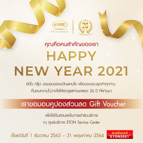 ETON Group (อีตั้น กรุ๊ป) มอบแคมเปญพิเศษ สุดยิ่งใหญ่ส่งท้ายปลายปี เพื่อมอบเป็นของขวัญให้แก่ลูกค้าทุกท่าน ด้วยการมอบคูปองส่วนลด (E-Voucher) เพื่อเข้ารับบริการที่ศูนย์บริการอีตั้น สาขาศรีนครินทร์เท่านั้น ในแคมเปญ “ETON New Year Gifts” เพื่อเป็นการขอบคุณลูกค้าที่มอบความไว้วางใจให้เราได้ดูแล ตลอด 26 ปีที่ผ่านมา