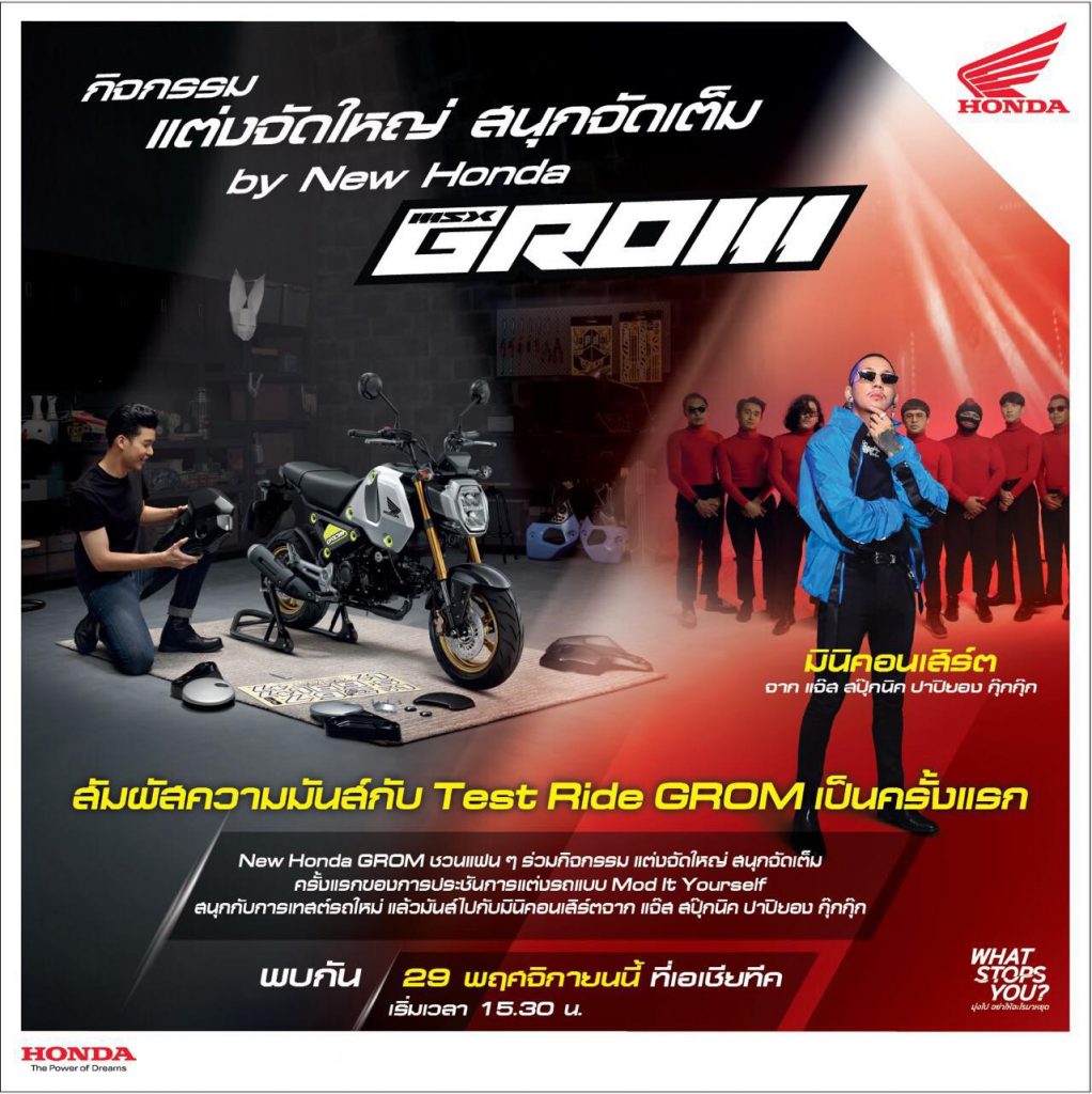 เอ.พี. ฮอนด้า เดินหน้าส่งมอบประสบการณ์ความสนุกให้กับแฟนคลับมินิไบค์รุ่นใหม่ล่าสุด ด้วยกิจกรรม New Honda GROM “แต่งจัดใหญ่ สนุกจัดเต็ม” ชวนสาวกและผู้ที่สนใจร่วมสัมผัสสมรรถนะ ณ ลานอเนกประสงค์ เอเชียทีค ในวันอาทิตย์ที่ 29 พฤศจิกายนนี้
