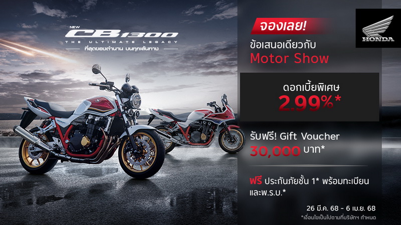 - Honda CB1300 ดอกเบี้ยพิเศษ 2.99% ฟรี! ประกันภัยชั้น 1 ทะเบียน และ พ.ร.บ. พร้อมรับ Gift Voucher มูลค่า 30,000 บาท