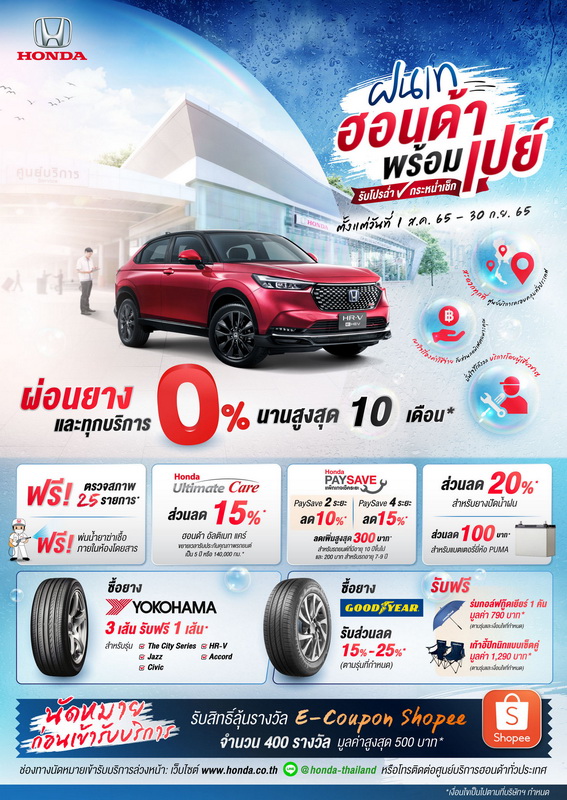 บริษัท ฮอนด้า ออโตโมบิล (ประเทศไทย) จำกัด ชวนลูกค้าเตรียมความพร้อมของรถยนต์ในช่วงฤดูฝน ไม่ว่าจะเดินทางใกล้-ไกล ก็อุ่นใจและปลอดภัยในทุกเส้นทาง กับแคมเปญ “ฝนเท ฮอนด้าพร้อมเปย์ รับโปรฉ่ำ กระหน่ำเช็ก” ด้วยบริการตรวจเช็กสภาพรถยนต์ฟรี 25 รายการ พร้อมเพิ่มความปลอดภัยในสถานการณ์การแพร่ระบาดของเชื้อโควิด-19 กับบริการฉีดพ่นน้ำยาฆ่าเชื้อโรคภายในรถยนต์ฟรี รวมทั้งมอบข้อเสนอพิเศษเฉพาะลูกค้าฮอนด้า เงื่อนไขตามที่บริษัทฯ กำหนด ทั้งโปรโมชันยาง อาทิ ซื้อยางโยโกฮาม่า 3 เส้นแถม 1 เส้น ส่วนลดพิเศษโปรแกรมขยายการรับประกันคุณภาพรถยนต์ อีก 2 ปี หรือ 40,000 กิโลเมตร ฮอนด้าอัลติเมทแคร์ (Honda Ultimate Care) และส่วนลดเพิ่มเติมแพ็กเกจเช็กระยะฮอนด้าเพย์เซฟ (Honda PaySave) ส่วนลดยางปัดน้ำฝน รวมถึงแบตเตอรี่ทางเลือกคุณภาพสูงยี่ห้อ PUMA โดยสามารถผ่อนชำระค่าใช้จ่ายงานบริการดอกเบี้ย 0% นานสูงสุด 6 เดือน และค่าใช้จ่ายยางรถยนต์นานสูงสุด 10 เดือน และสำหรับลูกค้าที่นัดหมายก่อนเข้ารับบริการประเภทงานเช็กระยะ หรือซ่อมทั่วไป มีโอกาสลุ้นรับรางวัล Shopee e-coupon มูลค่า 500 บาท และ 300 บาท รวม 400 รางวัล เพียงนัดหมายและนำรถยนต์เข้ารับบริการที่ศูนย์บริการฮอนด้าทั่วประเทศ ตั้งแต่วันที่ 1 สิงหาคม 2565 – 30 กันยายน 2565