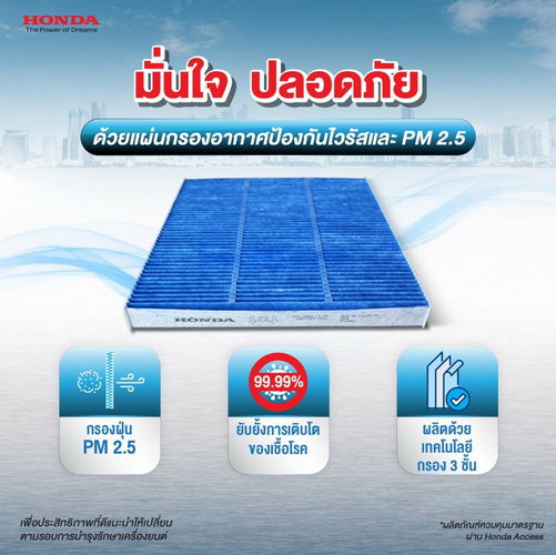 ในช่วงที่ทุกคนกำลังเผชิญปัญหามลภาวะทางอากาศที่เกิดขึ้นอย่างต่อเนื่อง ฮอนด้าขอแนะนำแผ่นกรองอากาศแอร์รุ่นใหม่ป้องกันไวรัสและฝุ่น PM 2.5 ซึ่งใช้สำหรับกรองอากาศภายในห้องโดยสารรถยนต์ โดยเป็นเทคโนโลยีกรอง 3 ชั้นจากประเทศเยอรมนี ที่สามารถยับยั้งการเติบโตและดักจับเชื้อโรค เชื้อไวรัส และแบคทีเรีย ขนาด 0.05 – 0.1 ไมครอน ตามมาตรฐาน ISO18184 โดยสามารถยับยั้งการเจริญเติบโตของเชื้อไข้หวัดใหญ่ H1N1 ได้ถึง 99.99% และเชื้อ HcoV 229E ซึ่งเป็นเชื้อตระกูลเดียวกับไวรัสโคโรน่าได้ถึง 99.999 % รวมถึงประสิทธิภาพในการกรองหมอกควันและมลพิษทางอากาศ โดยเฉพาะฝุ่น PM 2.5 ได้สูงถึง 90% ซึ่งจะช่วยเสริมประสิทธิภาพการไหลเวียนของอากาศในห้องโดยสาร ทำให้ได้รับอากาศที่สะอาดสดชื่น โดยลูกค้าฮอนด้าสามารถสอบถามรายละเอียดเพื่อนำรถยนต์เข้ารับการติดตั้งแผ่นกรองอากาศรุ่นใหม่ได้ในราคาพร้อมติดตั้ง 800 บาท (ราคายังไม่รวมภาษีมูลค่าเพิ่ม) ที่ศูนย์บริการฮอนด้าทั่วประเทศ