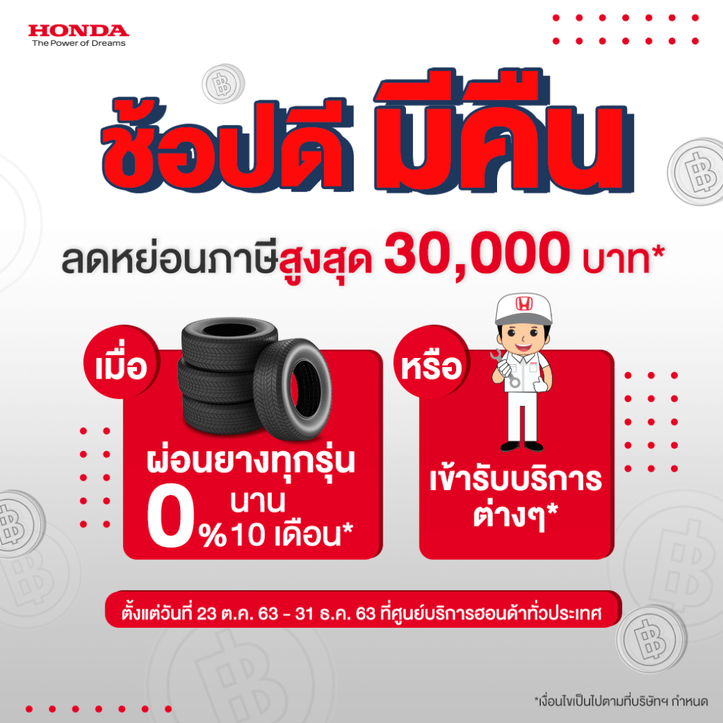 บริษัท ฮอนด้า ออโตโมบิล (ประเทศไทย) ชวนลูกค้าซื้อสินค้าและเข้ารับการบริการ* ณ โชว์รูมและศูนย์บริการฮอนด้าทั่วประเทศ ภายใต้โครงการ “ช้อปดีมีคืน” ตั้งแต่วันที่ 23 ตุลาคม – 31 ธันวาคม 2563 ซึ่งเป็นมาตรการช่วยกระตุ้นเศรษฐกิจของประเทศไทยในช่วงปลายปีโดยกระทรวงการคลัง โดยลูกค้าสามารถนำใบเสร็จรับเงินหรือใบกำกับภาษีแบบเต็มรูปแบบจากยอดค่าใช้จ่ายจริง สูงสุด 30,000 บาท มาลดหย่อนภาษีเงินได้บุคคลธรรมดาประจำปีภาษี 2563