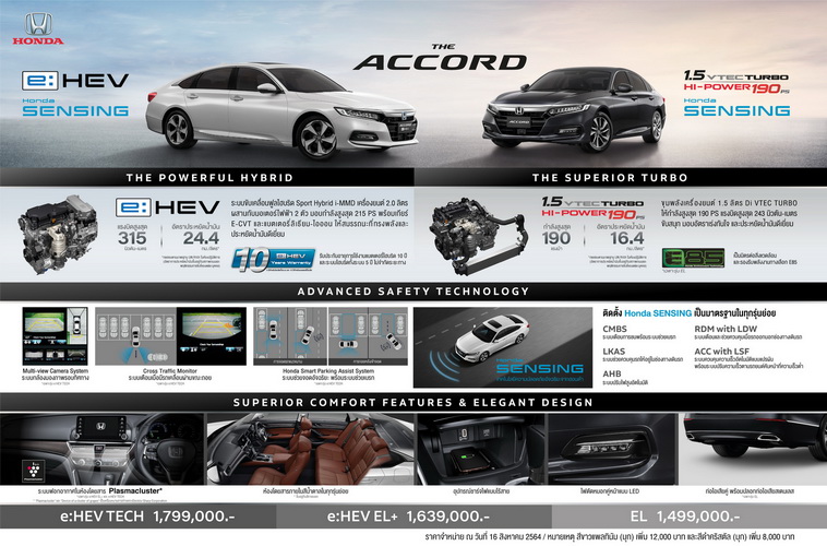 บริษัท ฮอนด้า ออโตโมบิล (ประเทศไทย) จำกัด เสริมความคุ้มค่าให้ ฮอนด้า แอคคอร์ด ตอกย้ำเส้นทางแห่งผู้นำด้านยนตรกรรมที่เปี่ยมด้วยเทคโนโลยีอันล้ำสมัย ทั้งด้านการขับเคลื่อน ขุมพลังเทอร์โบและฟูลไฮบริด และด้านความปลอดภัย มอบความมั่นใจในทุกการเดินทางด้วยเทคโนโลยีความปลอดภัยอัจฉริยะ ฮอนด้า เซนส์ซิ่ง (Honda SENSING) ซึ่งได้ติดตั้งเป็นมาตรฐานในทุกรุ่นย่อย อีกทั้งเพิ่มฟังก์ชันการใช้งานระดับพรีเมียมและเทคโนโลยีอำนวยความสะดวกสบายที่ครบครัน ครอบคลุมทุกรุ่นย่อย อาทิ ไฟตัดหมอกคู่หน้าแบบ LED อุปกรณ์ชาร์จไฟแบบไร้สาย กระจกมองหลังปรับลดแสงอัตโนมัติ ม่านบังแดดกระจกข้างด้านหลัง ช่องเชื่อมต่อ USB ด้านหลัง 2 ตำแหน่ง และเทคโนโลยีที่เชื่อมต่อเพื่อการสื่อสารระหว่างผู้ขับขี่และรถยนต์ Honda CONNECT พร้อมตอบสนองไลฟ์สไตล์ที่หลากหลาย เติมเต็มความต้องการของลูกค้าได้อย่างสมบูรณ์แบบในราคาที่คุ้มค่า เริ่มต้นที่ 1,499,000 บาท ใน แอคคอร์ด รุ่น EL และแนะนำ แอคคอร์ด e:HEV ที่มาพร้อมเอกลักษณ์ของยนตรกรรมไฮบริดด้วยโลโก้ H Mark ตกแต่งกรอบสีฟ้า และสัญลักษณ์ e:HEV มอบอากาศบริสุทธิ์ด้วยเทคโนโลยีระบบ
