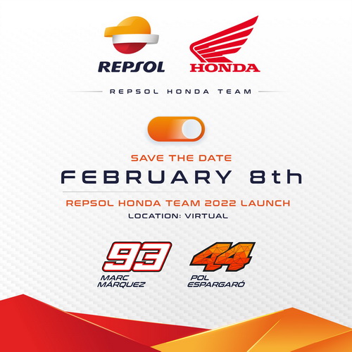 ยอดทีมแข่ง เรปโซล ฮอนด้า เผยกำหนดการเปิดตัวสองนักบิดในสังกัด นำโดย มาร์ค มาร์เกซ แชมป์โลก 8 สมัย เจ้าของหมายเลข 93 และทีมเมท โปล เอสปาร์กาโร่ ดาวบิดสแปนิช หมายเลข 44 พร้อมด้วยรถแข่ง Honda RC213V โฉมใหม่ล่าสุด ที่เตรียมลงสนามล่าแชมป์ โมโตจีพี ฤดูกาล 2022 โดยแฟนมอเตอร์สปอร์ตทั่วโลก สามารถรับชมพร้อมกันทางออนไลน์ ในวันที่ 8 กุมภาพันธ์นี้