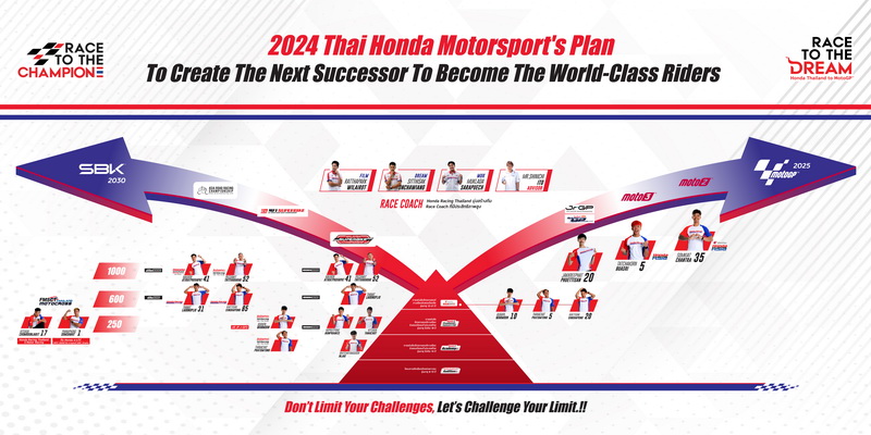 พัฒนานักแข่งด้วยทีม Race Coach ประสิทธิภาพสูง มอบหมาย “โค้ชมุกข์” มุกลดา สารพืช นักแข่งหญิงแกร่งมากประสบการณ์ มาทำงานร่วมกับ “โค้ชฟิล์ม” รัฐภาคย์ วิไลโรจน์ และ “โค้ชดรีม” สิทธิศักดิ์ อ่อนเฉวียง พร้อมที่ปรึกษาอย่าง มร.ชินอิจิ อิโต อดีตนักแข่งระดับเวิลด์กรังด์ปรีซ์ เพื่อผลักดันให้นักแข่งสร้างผลงานอย่างต่อเนื่องในทุกระดับและพัฒนาหลักสูตรการฝึกนักแข่งที่เข้มข้นเพื่อเป็นต้นแบบการสร้างนักแข่งของฮอนด้าในระดับเอเชียแอนด์โอเชียเนีย