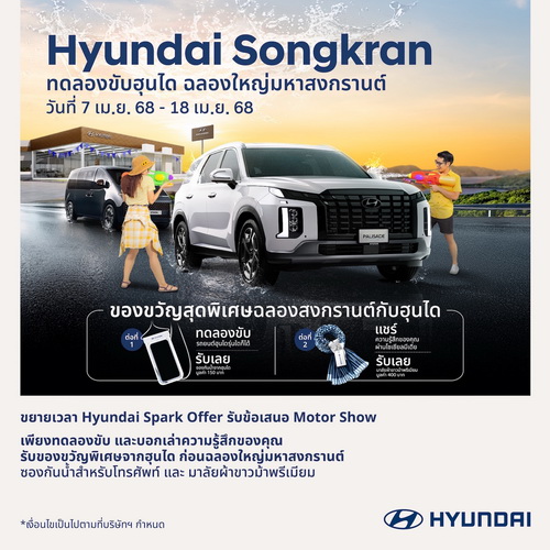 ฮุนได โมบิลิตี้ ประเทศไทย ชวนคุณมาฉลองสงกรานต์สุดคูลแบบไม่ซ้ำใคร กับกิจกรรม “Hyundai ฉลองใหญ่มหาสงกรานต์” ตั้งแต่วันที่ 7 – 18 เมษายน 2568 ที่ IONIQ Lab, H-Studio และ โชว์รูมฮุนไดทั่วประเทศ เพียงทดลองขับรถยนต์ฮุนไดรุ่นใดก็ได้ แล้วแชร์ประสบการณ์ดีๆ ผ่านโซเชียลมีเดียของคุณพร้อมติดแฮชแท็ก #HyundaiSongkran #HyundaiSparkOffer รับฟรี! ของขวัญสุดเอ็กคลูซีฟจากฮุนได ทั้งซองกันน้ำดีไซน์ลิมิเต็ดอิดิชันหรือมาลัยผ้าขาวม้าให้คุณเฉลิมฉลองเทศกาลสงกรานต์อย่างมีสไตล์ ด้วยไอเท็มสุดคูลสำหรับคุณและคนในครอบครัวจากฮุนได ขยายดีลฉ่ำรับสงกรานต์! ฮุนไดยังประกาศขยายเวลาโปรโมชันสุดร้อนแรง “HYUNDAI SPARK OFFER” เพื่อให้คุณเป็นเจ้าของรถยนต์ฮุนไดได้ง่าย ๆ ด้วยข้อเสนอเดียวกับงาน MOTOR SHOW 2025 มอบส่วนลดสูงสุด 330,000 บาท หรือเลือกผ่อนสบายๆ ด้วยดอกเบี้ย 0% นานสูงสุด 84 เดือน* สำหรับลูกค้าที่จองรถทุกรุ่นจากฮุนไดและรับรถภายในวันที่ 30 เมษายน 2568 ห้ามพลาด! โอกาสดีๆ มีแค่ปีละครั้งเท่านั้น