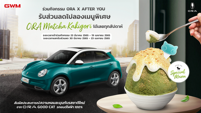 เกรท วอลล์ มอเตอร์ ผู้นำด้านยานยนต์ไฟฟ้าของไทย เดินหน้าสร้างประสบการณ์ใหม่ให้ผู้บริโภคด้วยการจับมือ บริษัท อาฟเตอร์ ยู จำกัด ผู้นำด้านธุรกิจขนมหวานและเครื่องดื่ม เปิดตัวแคมเปญคอลแลบบอเรชันสุดพิเศษ “Special Menu: After You x ORA Good Cat” ที่นำแรงบันดาลใจจากรถยนต์ไฟฟ้า 100% ORA Good Cat มารังสรรค์เป็นเมนูซิกเนเจอร์ “ORA Matcha Kakigori (โอรา มัทฉะ คากิโกริ)” ให้ผู้บริโภคในไทยได้ลิ้มลองที่ร้าน After You ทั้ง 40 สาขาทั่วประเทศ ตั้งแต่วันนี้จนถึงวันที่ 23 เมษายน 2565 พร้อมรับส่วนลดพิเศษทุกสัปดาห์ผ่านกิจกรรมในแอปพลิเคชัน GWM รวมถึงการทดลองขับที่ GWM Store หรือที่งานบางกอก อินเตอร์เนชั่นแนล มอเตอร์โชว์ ครั้งที่ 43