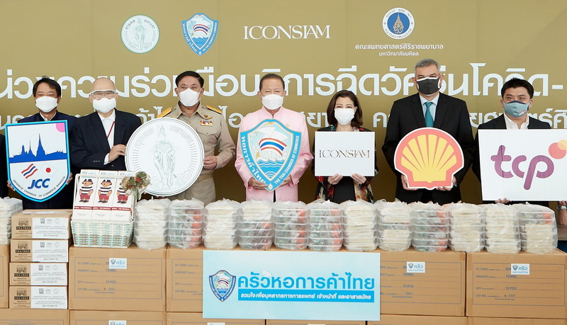 บริษัท เชลล์แห่งประเทศไทย จำกัด นำโดย นายปนันท์ ประจวบเหมาะ ประธานกรรมการ (ที่ 2 จากขวา) พร้อมด้วย พล.ต.อ.อัศวิน ขวัญเมือง ผู้ว่าราชการกรุงเทพมหานคร (ที่ 3 จากซ้าย) คณะกรรมการหอการค้าไทย นำโดยนายสนั่น อังอุบลกุล ประธานกรรมการหอการค้าไทย และสภาหอการค้าแห่งประเทศไทย (กลาง) ร่วมส่งมอบการสนับสนุนอาหารปรุงสุก ให้กำลังใจแก่บุคลากรทางการแพทย์ที่หน่วยความร่วมมือบริการฉีดวัคซีนโควิด-19 กรุงเทพมหานคร – หอการค้าไทย (ไอคอนสยาม) ผ่านโครงการ “ครัวหอการค้าไทย และหน่วยความร่วมมือบริการฉีดวัคซีนโควิด-19 กรุงเทพมหานคร – หอการค้าไทย” ซึ่งมีเป้าหมายในการจัดส่งอาหารปรุงสุกจากครัวชุมชนให้กับบุคลากรทางการแพทย์ เจ้าหน้าที่ และอาสาสมัคร ประจำหน่วยความร่วมมือฯ ในโอกาสนี้ ยังได้เข้าเยี่ยมชมหน่วยความร่วมมือฯ โดยมีคณะผู้บริหารไอคอนสยาม นำโดย นางชฎาทิพ จูตระกูล ประธานเจ้าหน้าที่บริหาร กลุ่มบริษัท สยามพิวรรธน์ ผู้บริหารไอคอนสยาม (ที่ 3 จากขวา) ให้การต้อนรับ กิจกรรมนี้เป็นส่วนหนึ่งของเชลล์ Powering Progress ด้วยการสนับสนุนและให้ความร่วมมือกับทุกภาคส่วนพร้อมอยู่เคียงข้างสังคมไทยในทุกสถานการณ์