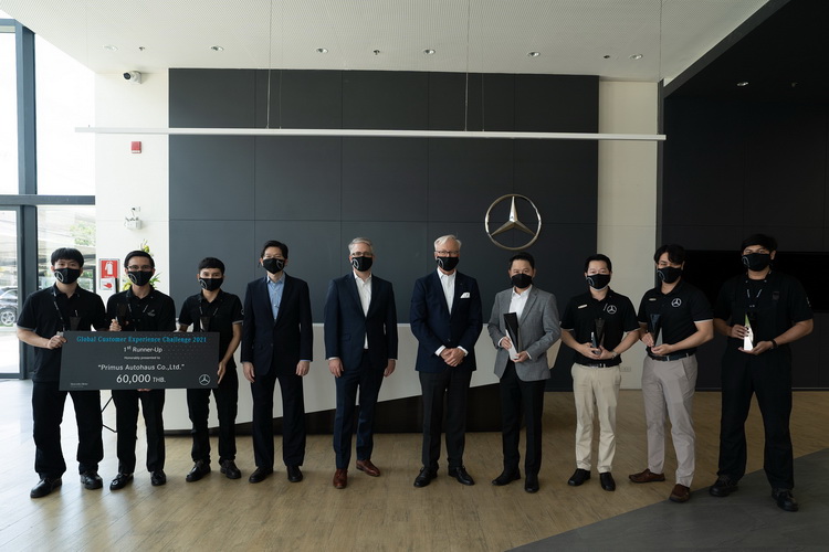 นายจิระพล รุจิวิพัฒน์ (ที่ 4 จากขวา) กรรมการผู้จัดการ บริษัท ไพรม์มัส ออโต้เฮาส์ จำกัด รับโล่รางวัลรองชนะเลิศอันดับ 1 ประเภททีม-บุคคล และเงินรางวัล มูลค่า 60,000 บาท ในการแข่งขัน Global Customer Experience Challenge (GCEC) โดยมี นายโรลันด์ โฟลเกอร์ (ที่ 5 จากขวา) ประธานบริหาร บริษัท เมอร์เซเดส-เบนซ์ (ประเทศไทย) จำกัด พร้อมนายบีเยิร์น กุซเทรา (ที่ 5 จากซ้าย) รองประธานบริหาร ฝ่ายขายและการตลาด และ นายพุทธิ ตุลยธัญ (ที่ 4 จากซ้าย) รองประธานบริหาร ฝ่ายบริการหลังการขาย บริษัท เมอร์เซเดส-เบนซ์ (ประเทศไทย) จำกัด ให้เกียรติเป็นผู้มอบ และถ่ายภาพร่วมกับบริหารระดับสูง และทีมแข่งขัน “เบนซ์ไพรม์มัส” ณ ศูนย์ฝึกอบรม เมอร์เซเดส-เบนซ์ (ประเทศไทย) บางนา-ตราด กม.19