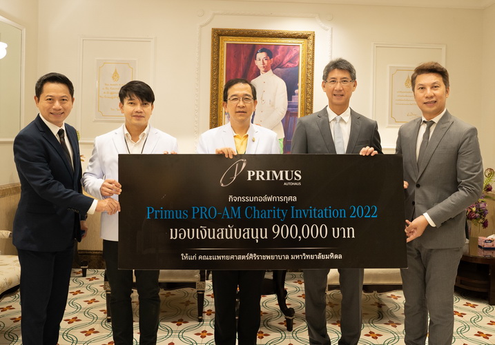 นายณัฏฐวุฒิ ตั้งคารวคุณ ประธาน (ที่ 2 จากขวา), นายจิระพล รุจิวิพัฒน์ กรรมการผู้จัดการ (ที่ 1 จากซ้าย) และนายศราวิช ไชยมังกร ผู้จัดการทั่วไป ฝ่ายขาย (ที่ 1 จากขวา) บริษัท ไพรม์มัส ออโต้เฮาส์ จำกัด มอบเงินรายได้จากการจัดแข่งขันกอล์ฟการกุศล Primus Pro-Am Charity Invitation 2022 ที่สนาม The RG City Golf Club จ.ปทุมธานี เมื่อวันที่ 15 พ.ย.ที่ผ่านมาพร้อมร่วมสมทบเงินบริจาค เนื่องในโอกาสครบรอบก้าวสู่ปีที่ 3 รวมเป็นเงินทั้งสิ้น 900,000 บาท ให้แก่คณะแพทยศาสตร์ศิริราชพยาบาล มหาวิทยาลัยมหิดล โดยมี ศ.นพ.ธวัชชัย อัครวีพุธ รองคณบดี และผู้อำนวยการโรงเรียนแพทย์ศิริราช (ที่ 3 จากซ้าย) และ รศ.นพ.นริศ กิจณรงค์ แพทย์ประจำภาควิชาจักษุวิทยา (ที่ 2 จากซ้าย) ให้เกียรติเป็นผู้รับมอบในครั้งนี้ ณ ตึกอำนวยการ ชั้น 1 รพ.ศิริราช