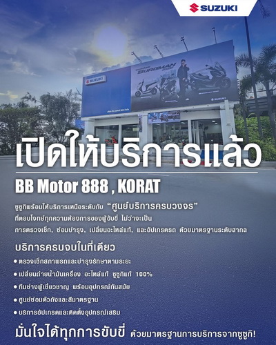 ซ่อมบำรุง เปลี่ยนอะไหล่แท้ เปิดศูนย์บริการซูซูกิที่โคราช ซูซูกิพร้อมให้บริการเหนือระดับกับ “ศูนย์บริการครบวงจร” ที่ตอบโจทย์ทุกความต้องการของผู้ขับขี่ ไม่ว่าจะเป็น การตรวจเช็ก