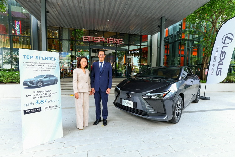 เลกซัส ประเทศไทย จับมือ EM DISTRICT กระตุ้นตลาดต่อเนื่องในไตรมาสที่ 4 ด้วยการจัดแคมเปญใหญ่ แจกรถยนต์ไฟฟ้า LEXUS RZ 450e Luxury สี SONIC IRIDIUM มูลค่า 3.87 ล้านบาท ให้กับสุดยอดนักช้อปที่มียอดใช้จ่ายสะสมรวมสูงสุดตลอดแคมเปญ เริ่มต้นที่ 50 ล้านบาทขึ้นไป ระหว่าง วันที่ 1 กันยายน จนถึง วันที่ 1 ธันวาคม 2567 ที่ศูนย์การค้าเอ็มโพเรียม เอ็มควอเทียร์ และเอ็มสเฟียร์