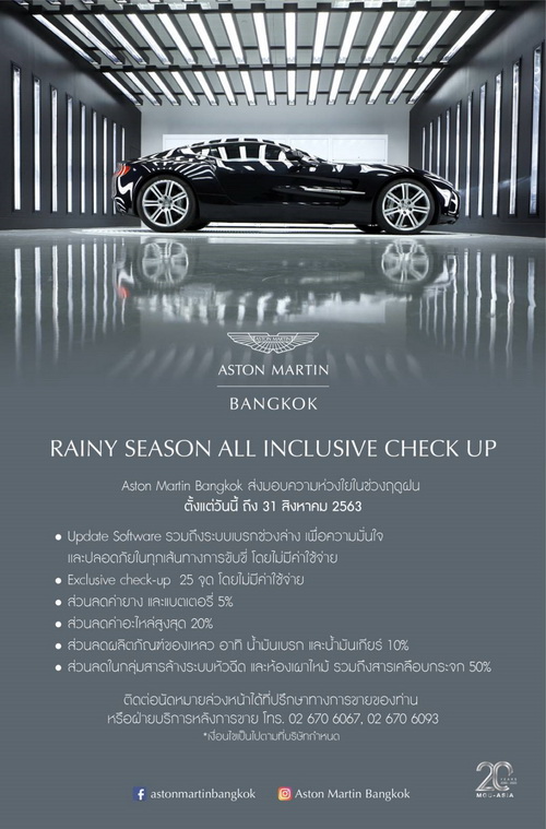 กลุ่มธุรกิจ มาสเตอร์ กรุ๊ป คอร์ปอเรชั่น (เอเชีย) จัดโปรโมชั่นพิเศษ สำหรับเจ้าของยนตรกรรมกลุ่มลักชัวรี่ในเครือฯ ได้แก่ โรลส์-รอยซ์, แอสตัน มาร์ติน และ มาเซราติ เพื่อให้เพิ่มความปลอดภัยและมั่นใจในฤดูฝน กับแคมเปญ ‘Rainy Season All-Inclusive Checkup’ ซึ่งลูกค้าสามารถนำรถเข้ารับบริการ ได้ตั้งแต่วันนี้ ถึง 31 สิงหาคม 2563