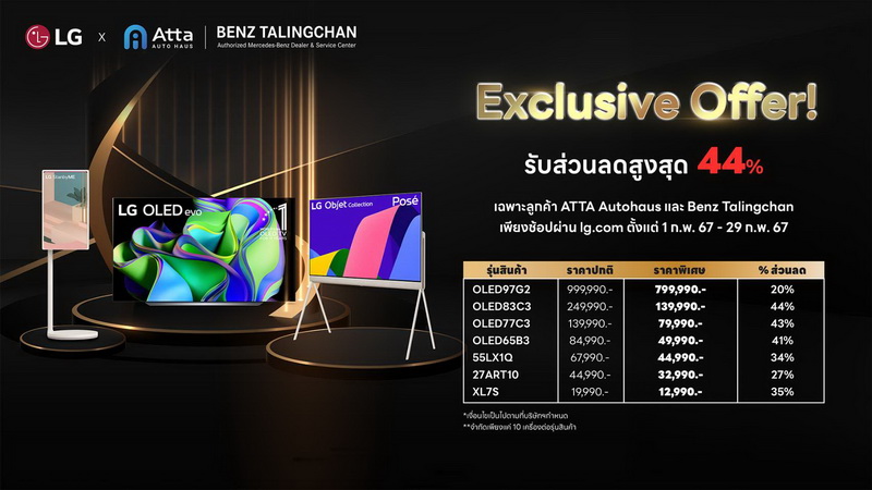 แอทต้า ออโต้เฮ้าส์ยังมอบของขวัญสุดพิเศษเป็น LG StanbyMEจอไลฟ์สไตล์มูลค่า 44,990 บาทให้แก่ลูกค้าที่จองรถเมอร์เซเดส–เบนซ์รุ่นใดก็ได้ รวมถึงรถยนต์สำหรับกลุ่มผู้บริหาร (Executive car) ทุกรุ่น ตั้งแต่วันนี้จนถึงวันที่ 31 มกราคม 2567 นอกจากนี้ แอลจียังมอบส่วนลดพิเศษสูงสุด 44% ให้แก่ลูกค้าแอทต้า ออโต้เฮ้าส์และเบนซ์ตลิ่งชันที่สนใจสินค้าทีวีของแอลจี