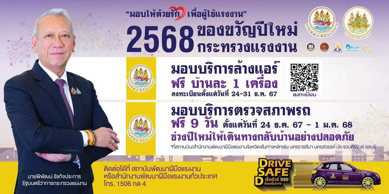 บริษัท โตโยต้า มอเตอร์ ประเทศไทย จำกัด ร่วมกับ ผู้แทนจำหน่ายโตโยต้า เข้าร่วมงาน “โครงการ Drive Safe D เช็คชัวร์ ก่อนเดินทาง” โดยท่านรัฐมนตรีว่าการกระทรวงแรงงาน นายพิพัฒน์ รัชกิจประการ เป็นประธานในพิธีเปิดงาน เมื่อวันที่ 24 ธันวาคม 2567 ที่ผ่านมา ณ กระทรวงแรงงาน