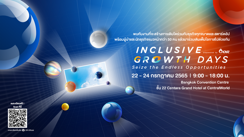 บริษัท ปตท. น้ำมันและการค้าปลีก จำกัด (มหาชน) หรือ โออาร์ เชิญชวนประชาชน ผู้ประกอบการธุรกิจทุกขนาด และสตาร์ตอัป ร่วมงานเสวนาและโชว์เคสธุรกิจครั้งยิ่งใหญ่แห่งปี “Inclusive Growth Days empowered by OR” ระดม 50 ผู้ทรงคุณวุฒิ และนักธุรกิจชั้นนำ ร่วมเจาะลึกโมเดลธุรกิจแห่งอนาคตที่จะมาช่วยต่อยอดการลงทุน ผู้เชี่ยวชาญวงการสตาร์ตอัปมาไขรหัสแห่งความสำเร็จ ทั้งด้านเศรษฐกิจ การเงินการลงทุน สุขภาพ สิ่งแวดล้อม นวัตกรรม ฯลฯ ตลอด 3 วันเต็ม 22-24 กรกฎาคมนี้ ที่จะมีหลากหลายธีม