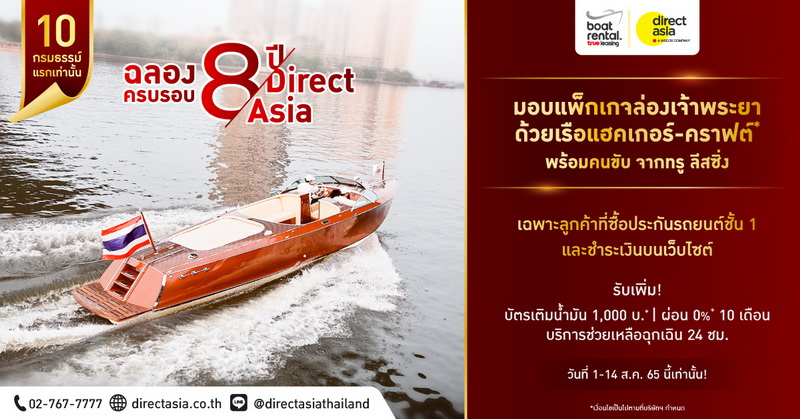 นายวรวุฒิ วาริการ ประธานกรรมการบริหาร บริษัท ไดเร็ค เอเชีย (ประเทศไทย) จำกัด เปิดเผยว่า ผลกระทบจากเศรษฐกิจในประเทศไทย ทั้งค่าครองชีพ ราคาน้ำมันที่ปรับตัวสูงขึ้นต่อเนื่องกินระยะเวลาร่วมปี และภาวะเงินเฟ้อ พบว่าไม่ได้มีผลต่อความต้องการซื้อประกันรถยนต์ชั้น 1 ของลูกค้า ไดเร็ค เอเชีย อย่างมีนัยสำคัญ โดยการเลือกซื้อประกันภัยรถยนต์ของลูกค้าในช่วงครึ่งปีแรกที่ผ่านมา ประกันภัยรถยนต์ชั้น 1 ยังคงเป็นที่นิยม และลูกค้าเลือกซื้อมากที่สุด ในโอกาสที่ ไดเร็ค เอเชีย ดำเนินธุรกิจครบรอบ 8 ปี พร้อมอยู่กับคุณตั้งแต่ต้นจนจบ และเพื่อเป็นการขอบคุณลูกค้าที่ให้การสนับสนุนบริษัทฯ มาอย่างยาวนาน ไดเร็ค เอเชีย ขอมอบแพ็กเกจล่องเจ้าพระยาด้วยเรือแฮคเกอร์-คราฟต์ พร้อมคนขับ จาก ทรู ลีสซิ่ง* สำหรับลูกค้าที่ซื้อประกันภัยรถยนต์ชั้น 1 และชำระเงินบนเว็บไซต์ 10 กรมธรรม์แรก ตั้งแต่วันนี้ – 14 สิงหาคม 2565 นี้