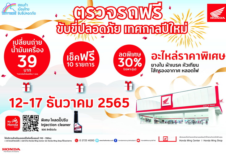 ไทยฮอนด้าต้อนรับปีใหม่มอบการบริการและดูแลลูกค้า ตรวจเช็กสภาพรถฟรีกว่า 10 รายการ และบริการเปลี่ยนถ่ายน้ำมันเครื่องฟรี (ไม่รวมค่าน้ำมันเครื่อง) ไปจนถึงสินค้าลดราคาพิเศษสูงสุด 30% เฉพาะรุ่น และสินค้าอะไหล่ราคาพิเศษ ได้แก่ ยางใน ผ้าเบรก หัวเทียน ไส้กรองอากาศ และหลอดไฟสามารถเข้ารับการบริการได้แล้ว ตั้งแต่วันที่ 12 – 17 ธันวาคม 2565 ที่ร้านผู้จำหน่าย Honda Wing Center และ Honda Wing Shop ที่ร่วมรายการ เงื่อนไขเป็นไปตามที่บริษัทฯ กำหนด