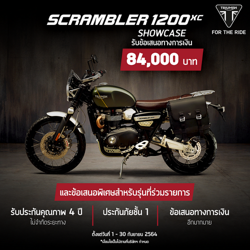 โอกาสของบิ๊กไบค์ไรเดอร์มาถึงแล้ว โปรโมชันแรงเดือนกันยายนสำหรับรถจักรยานยนต์รุ่น “สแครมเบลอร์ 1200 เอ็กซ์ซี โชว์เคส” (Scrambler 1200 XC Showcase) ราคา 676,000 บาท พร้อมรับข้อเสนอทางการเงินมูลค่าถึง 84,000 บาท นอกจากนี้ยังมีข้อเสนอสุดพิเศษสำหรับรุ่นอื่นๆ ที่ร่วมรายการ อาทิเช่น รับประกันคุณภาพของรถจักรยานยนต์ถึง 4 ปี โดยไม่จำกัดระยะทาง (Triumph Factory Warranty) รับฟรีประกันภัยชั้น 1 และข้อเสนอทางการเงินอีกมากมาย คุ้มค่าแบบนี้ไรเดอร์ตัวจริงต้องโดน! โดยโปรโมชันเริ่มตั้งแต่วันนี้จนถึงวันที่ 30 กันยายน 2564