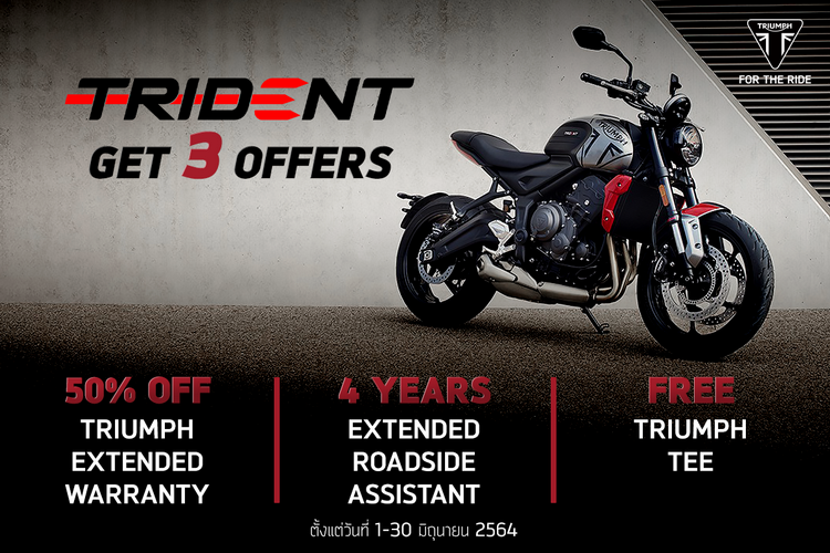 นางสาวจิราพร สำเร็จกิจเจริญ ผู้จัดการฝ่ายการตลาด บริษัท ไทรอัมพ์ มอเตอร์ไซเคิลส์ (ไทยแลนด์) จำกัด เปิดเผยว่าเพื่อเป็นการมอบโอกาสให้นักขี่รุ่นใหม่เป็นเจ้าของไทรเดนท์ 660 (Trident 660) ได้ง่ายยิ่งขึ้น ไทรอัมพ์ฯ จึงมอบข้อเสนอสุดพิเศษสำหรับผู้ที่จับจองรถจักรยานยนต์ไทรเดนท์ 660 (Trident 660) ภายในเดือนมิถุนายน 2564 โดยจะได้รับสิทธิพิเศษ 3 ข้อทันที ได้แก่