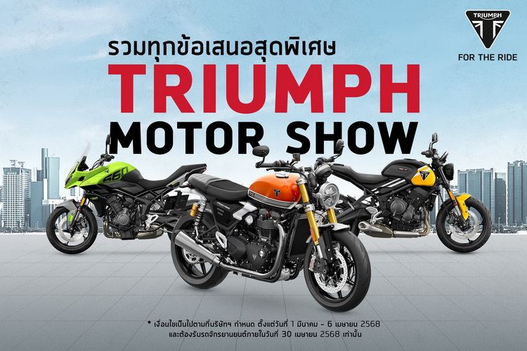 ไทรอัมพ์ มอเตอร์ไซเคิลส์ เดินหน้ามอบความร้อนแรงต่อเนื่อง ต้อนรับงานมอเตอร์โชว์ 2025 สำหรับลูกค้าให้เป็นเจ้าของรถจักรยานยนต์สัญชาติอังกฤษที่ชื่นชอบ ด้วยข้อเสนอพิเศษจัดเต็มครบทุกเซกเมนต์ ไม่ว่าจะเป็น กลุ่มรถจักรยานยนต์ Modern Classics และ Rocket 3 รับแพคเกจ 3-Year Worry Free พร้อมรับข้อเสนอทางการเงินสูงสุด 55,000 บาท กลุ่มรถจักรยานยนต์ Roadster / Sport และ Adventure รับข้อเสนอทางการเงินสูงสุด 250,000 บาท ทั้งนี้โปรโมชั่นดังกล่าวเริ่มตั้งแต่วันที่ 1 มีนาคม 2568 – วันที่ 6 เมษายน 2568