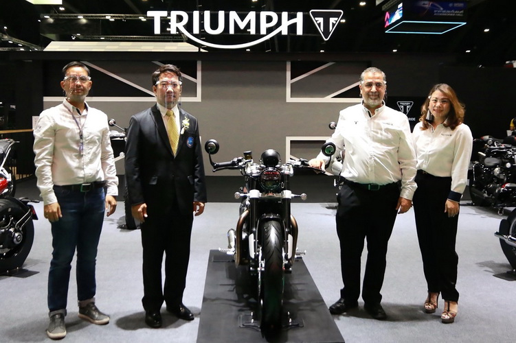 มร.มาร์เซโล ซิลวา ผู้อำนวยการภูมิภาคเอเชียแปซิฟิกฝ่ายขายและการตลาด บริษัท ไทรอัมพ์ มอเตอร์ไซเคิลส์ จำกัด (ที่ 3 จากซ้าย) พร้อมนายพีระพงศ์ เอี่ยมลำเนา รองประธานจัดงานบางกอก อินเตอร์เนชั่นแนล มอเตอร์โชว์ ครั้งที่ 41 (ที่ 2 จากซ้าย) ร่วมเผยโฉมรถไทรอัมพ์ รุ่นลิมิเต็ด อิดิชัน ได้แก่ Bobber TFC ที่ผลิตขึ้นจำนวนจำกัดเพียง 750 คันทั่วโลก และ 2 รุ่น สเปเชี่ยล อิดิชัน ได้แก่ Bonneville T120 BUD EKINS และ Bonneville T100 BUD EKINS ที่ได้รับการรังสรรค์ขึ้นเพื่อเฉลิมฉลองให้กับ Bud Ekins นักขี่สตันท์แมนผู้เป็นตำนานแห่งวงการจักรยานยนต์ โดยกิจกรรมดังกล่าวจัดขึ้นเมื่อเร็วๆ นี้ ณ บูธไทรอัมพ์ ภายในงานมอเตอร์โชว์ ครั้งที่ 41 อาคารชาเลนเจอร์ ฮอลล์ อิมแพค เมืองทองธานี