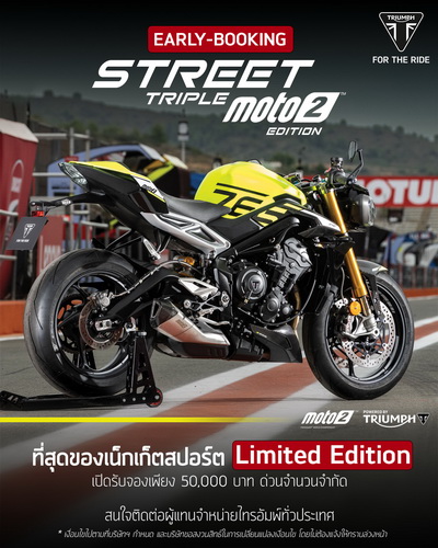 ไทรอัมพ์ มอเตอร์ไซเคิลส์ ประเดิมศักราชใหม่สุดร้อนแรง เปิดให้ไรเดอร์สามารถเป็นเจ้าของ “สตรีท ทริปเปิล 765 โมโตทู อิดิชัน” (Street Triple 765 Moto2™ Edition) รถจักรยานยนต์สตรีท ทริปเปิล ลิมิเต็ด อิดิชัน รุ่นใหม่ล่าสุด ที่มาพร้อมความสมบูรณ์แบบและมีสเปคสูงที่สุดเท่าที่เคยมีมา โดยมี 2 สีให้เลือกที่ได้รับแรงบันดาลใจจากการแข่งขันรายการ Moto2™ ได้แก่สี Triumph Racing Yellow และสี Crystal White ซึ่งผลิตขึ้นจำกัดเพียงสีละ 765 คันทั่วโลก รวมถึงยังมีรายละเอียดระดับพรีเมียมมากมายที่รอให้ทุกคนได้จับจองเป็นเจ้าของก่อนใคร สำหรับประเทศไทยราคาประมาณการอยู่ที่ 590,000 – 620,000 บาท จองวันนี้สามารถรับรถได้ช่วงเดือนเมษายนจนถึงพฤษภาคม 2566