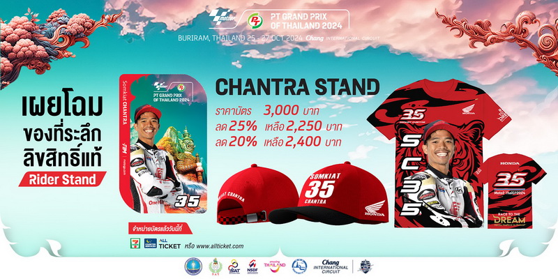 ความเคลื่อนไหวศึกรถจักรยานยนต์ทางเรียบชิงแชมป์โลก หรือ MotoGP ที่ประเทศไทย จะเป็นเจ้าภาพ สนามที่ 18 ภายใต้ชื่อรายการ “PT Grand Prix of Thailand 2024” ระหว่าง 25-27 ตุลาคม 2567 ที่ สนามช้าง อินเตอร์เนชั่นแนล เซอร์กิต จ.บุรีรัมย์ ล่าสุดฝ่ายจัดการแข่งขันได้เผยโฉมของที่ระลึก ลิขสิทธิ์แท้ “ไรเดอร์ สแตนด์” คอลเลกชัน 2024 สำหรับกองเชียร์นักแข่ง 3 คน ที่จะมีอัฒจันทร์แบบเอ็กซ์คลูซีฟและยังได้รับสินค้าลิขสิทธิ์แท้จากนักแข่งอีกด้วย ได้แก่ “จันทรา สแตนด์” สำหรับแฟน ก้อง-สมเกียรติ จันทรา จากฮอนด้า ประกอบไปด้วย เสื้อและหมวก โดยเสื้อถูกออกแบบโดยมีลายเสือ ซึ่งเป็นปีเกิดนักบิดสายเลือดไทยคนนี้ ซึ่งมีเรื่องเล่าถูกใจสายมู คือเมื่อตัดสินใจเปลี่ยนสัญลักษณ์ก้องเป็นรูปเสือ ก็มีข่าวดี โดยก้องก็ได้ขยับขึ้นไปสู่พรีเมียร์คลาส หรือรุ่นใหญ่สุดในระดับเวิลด์ กรังด์ปรีซ์