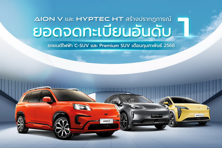 AION Thailand สร้างปรากฏการณ์ยอดจดทะเบียนในเดือนกุมภาพันธ์ 2568 คว้าตำแหน่งยอดจดทะเบียนอันดับ 1 และอันดับ 2 ในกลุ่มรถยนต์ไฟฟ้า C-SUV ในรุ่น AION V และ AION Y Plus ตามลำดับ และคว้าตำแหน่ง ยอดจดทะเบียนอันดับ 1 รถยนต์ไฟฟ้า Premium SUV ในรุ่น HYPTEC HT สะท้อนถึงความเชื่อมั่นจากผู้บริโภคชาวไทย ที่ไว้วางใจและเลือกใช้รถยนต์ไฟฟ้าอัจฉริยะ AION และ HYPTEC