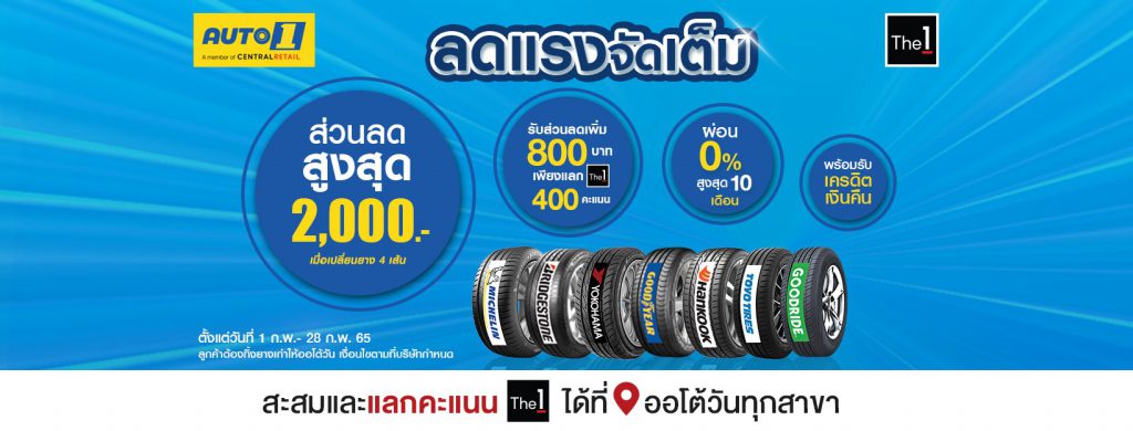 ออโต้วัน (AUTO1) ศูนย์บริการรถยนต์ครบวงจร ภายใต้บริษัท ซีอาร์ซี ไทวัสดุ จำกัด ในเครือเซ็นทรัล รีเทล ปล่อยโปรโมชันพิเศษฉลองเดือนแห่งความรัก เอาใจคนรักรถ กับโปรแรงสุดคุ้มเมื่อเปลี่ยนยางรถยนต์ 4 เส้น ที่ออโต้วันทุกสาขา รับส่วนลดสูงสุดมูลค่า 2,000 บาท จากยางแบรนด์ดังที่ร่วมรายการ อาทิ Michelin Bridgestone Yokohama Toyotires Goodyear Hankook และ Goodride นอกจากนี้สามารถผ่อนสินค้าทั้งร้าน 0% นานสูงสุด 10 เดือน พร้อมรับเครดิตเงินคืน กับบัตรเครดิตที่ร่วมรายการ พิเศษสุดๆ สำหรับสมาชิก The1 รับส่วนลดพิเศษเพิ่มอีก 800 บาท เมื่อแลก 400 คะแนน (เมื่อซื้อสินค้าตั้งแต่ 8,000 บาทขึ้นไป ไม่ร่วมรายการผ่อนชำระ ไม่ร่วมรายการ 1 เเถม 1,3 เเถม 1 เเละไม่ร่วมโปรโมชั่นอื่นๆ) ทุก 50 บาทสะสมคะแนนเดอะวันเท่ากับ 1 คะแนน โปรโมชั่นดังกล่าวเริ่มตั้งแต่วันนี้ – 28 กุมภาพันธ์ 2565 นี้เท่านั้น
