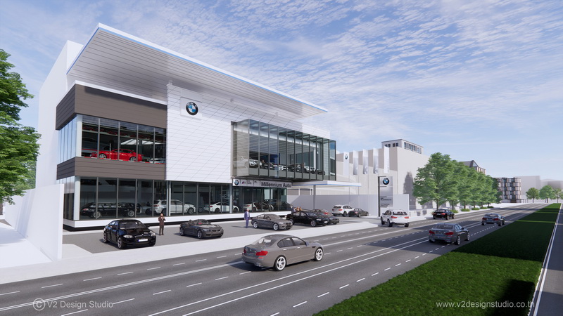 แนวคิดทางการออกแบบดังกล่าว ได้รับการถ่ายทอดสู่แฟลกชิปโชว์รูม บีเอ็มดับเบิลยู มิลเลนเนียม ออโต้ พัฒนาการ-ศรีนครินทร์ เริ่มจาก Architectural Façade ที่จัดวางกล่องกระจกระนาบแนวนอนขนาดใหญ่ ในลักษณะที่เหมือนกำลังลอยเคลื่อนออกจากกัน (Floating Box) ช่วยขยายการมองเห็นของอาคารได้เต็มหน้ากว้างถนน และแบ่ง Façade ออกเป็น 3 หน้าต่างย่อย ตามกลุ่มรถที่ต่างกัน โถงจัดแสดงหลักชั้นล่างปลอดโปร่ง เชื่อมต่อเป็นมุมกว้างคล้ายแกลเลอรี่ กับองศาในการจัดวางรถยนต์ที่มีความหลากหลาย แทรกด้วยพื้นที่รับรองลูกค้า เรียกว่า ‘customer stage’ แสดงถึงการให้ความสำคัญกับลูกค้าเป็นอันแรก ต่างจากอดีตที่ผลิตภัณฑ์มักต้องมาก่อน