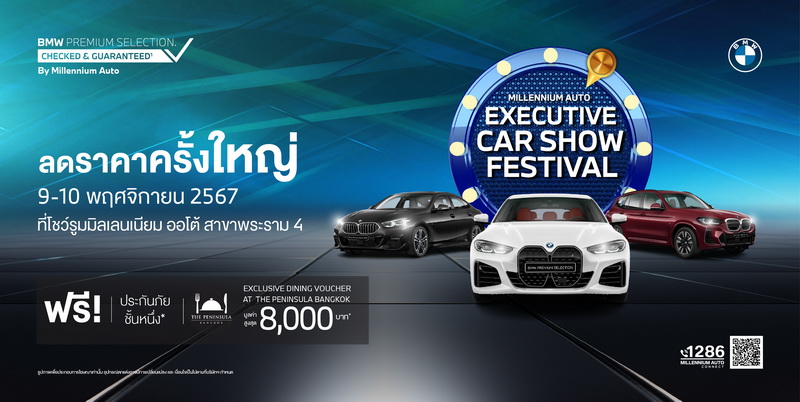 เป็นเจ้าของรถยนต์ในฝันของคุณก่อนใคร แบบไม่ต้องรอ มอเตอร์ เอ็กซ์โป บีเอ็มดับเบิลยู มิลเลนเนียม ออโต้ สานฝันผู้มีใจรักยนตรกรรมระดับพรีเมียมจากประเทศเยอรมนี จัดแคมเปญเด็ดประจำเดือนพฤจิกายน ‘Spin & Win The Ultimate Offer’ ให้ลูกค้าได้เป็นเจ้าของยนตรกรรมในฝันก่อนใคร กับหลากหลายข้อเสนอพิเศษแบบคุ้มค่าที่สุด ผ่อนเริ่มต้นเพียง 15,999 บาทต่อเดือน ดาวน์ 0% ดอกเบี้ยพิเศษ 1.99% ประกันภัยชั้นหนึ่ง นานสูงสุด 3 ปี ขับฟรี 4 เดือน (สำหรับรุ่นที่ร่วมรายการ) ฟรี Wall Box สำหรับรถยนต์ไฟฟ้าทุกรุ่น เพิ่มมูลค่ารถเทรด-อินสูงสุดถึง 100,000 บาท คูปองเช่ารถฟรีกับ SIXT 4 วัน (สำหรับรุ่นที่ร่วมรายการ)