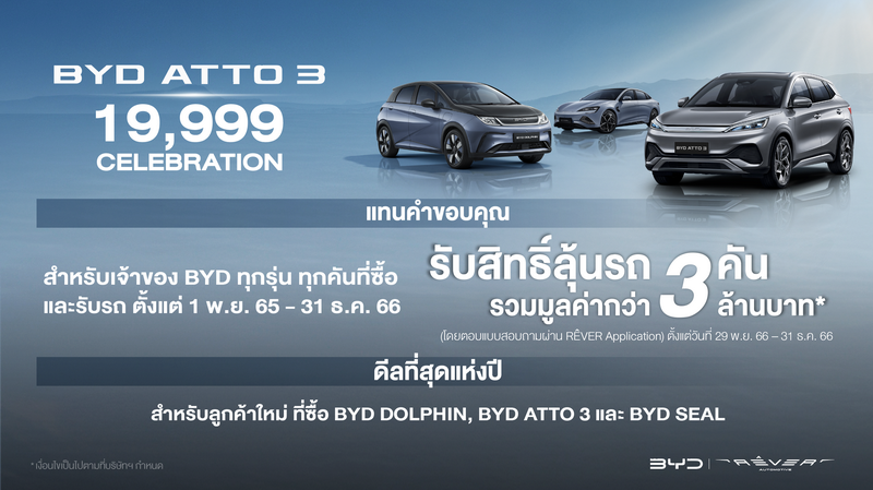 ภายในบูธบีวายดี งานมหกรรมยานยนต์ครั้งที่ 40 นี้ ทางเรเว่ จัดโปรโมชั่นขอบคุณสำหรับลูกค้าที่ซื้อรถยนต์ไฟฟ้าบีวายดีทุกรุ่น ไม่ว่าจะเป็นลูกค้าเก่าหรือลูกค้าใหม่ ด้วยภายใต้แคมเปญ “Big Thanks” ซื้อรถยนต์ไฟฟ้า บีวายดีทุกรุ่น ทุกคันตั้งแต่คันแรกตั้งแต่วันที่ 1 พฤศจิกายน 2565 – 31 ธันวาคม 2566 ลุ้นรับรถ 3 คัน มูลค่ากว่า 3 ล้านบาท (โดยกรอกแบบสอบถามผ่านทาง RÊVER Application ได้ตั้งแต่วันที่ 29 พ.ย. 66 – 31 ธ.ค. 66) และยังมีโปรโมชั่นสำหรับรถยนต์ไฟฟ้าแต่ละรุ่นของบีวายดีอีกด้วย