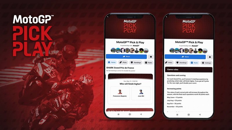MotoGP™ Pick & Play ช่วยให้แฟน ๆ ของการแข่งขันรถจักรยานยนต์ชิงแชมป์ที่เร็วที่สุดในโลกมีส่วนร่วมในการกระทําโดยการเลือกผู้ขับขี่ในการต่อสู้รายสัปดาห์จะจบไปข้างหน้า การเล่นเพื่อความสนุกสนาน (และเกียรติยศ!) แต่ละแบบทดสอบความรู้ของแฟน ๆ เกี่ยวกับกีฬาโดยมีผู้ขับขี่สองคนวางตัวต่อตัวในแต่ละกรังปรีซ์ ผู้เล่นเพียงแค่ต้องเลือกผู้ขับขี่ที่พวกเขาคิดว่าจะจบไปข้างหน้าและมีทางเลือกที่น่าสนใจสําหรับรอบแรกที่ Le Mans