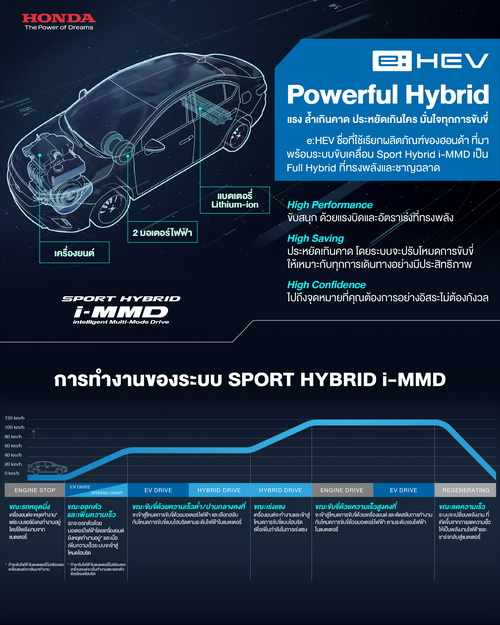บริษัท ฮอนด้า ออโตโมบิล (ประเทศไทย) จำกัด ตอกย้ำความทรงพลังและการทำงานอย่างชาญฉลาดของระบบขับเคลื่อนไฮบริด Sport Hybrid Intelligent Multi-Mode Drive (i-MMD) ซึ่งเป็นระบบ Full Hybrid โดยได้สื่อสารถึงผลิตภัณฑ์รถยนต์ที่มาพร้อมระบบขับเคลื่อนไฮบริด ในชื่อ อี:เอชอีวี (e:HEV) และเริ่มในรุ่น ฮอนด้า ซิตี้ อี:เอชอีวี เป็นครั้งแรกในประเทศไทย