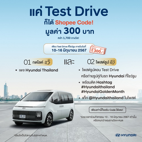 Hyundai Golden Month กิจกรรมสุดพิเศษที่ ฮุนได โมบิลิตี้ ประเทศไทย จัดขึ้นเพื่อตอบแทนลูกค้าชาวไทย เพียงทดลองขับรถยนต์ฮุนไดที่โชว์รูมฮุนไดสาขาใดก็ได้ ระหว่างวันที่ 10 – 16 มิถุนายน 2567 รับรหัสคูปอง Shopee มูลค่า 300 บาท จำนวนจำกัด 1,700 ใบ1 สำหรับผู้ที่จองและรับรถยนต์ฮุนไดรุ่น Staria, Stargazer, Creta, H1 หรือ Santa Fe ภายในวันที่ 30 มิถุนายน 2567 มีสิทธิ์ลุ้นรับบัตรกำนัล Aurora มูลค่า 100,000 บาท จำนวน 20 รางวัล1 รวมจำนวนของรางวัลทั้งหมด 1,720 รางวัล มูลค่ารวมกันทั้งสิ้นกว่า 2,510,000 บาท สอบถามข้อมูลเพิ่มเติมของกิจกรรม Hyundai Golden Month และรายละเอียดข้อเสนอพิเศษให้คุณเป็นเจ้าของรถยนต์ฮุนไดได้ง่ายกว่าเคย ที่ผู้แทนจำหน่ายรถยนต์ฮุนไดใกล้บ้านท่านรวมถึง H-SPACE ถนนวิภาวดี, IONIQ Lab ณ True Digital Park ชั้นหนึ่ง และ H-STUDIO ณ Emsphere ชั้นสอง และสามารถค้นหาข้อมูลเพิ่มเติมของรถยนต์ฮุนไดทุกรุ่นได้ที่ hyundai.com/th