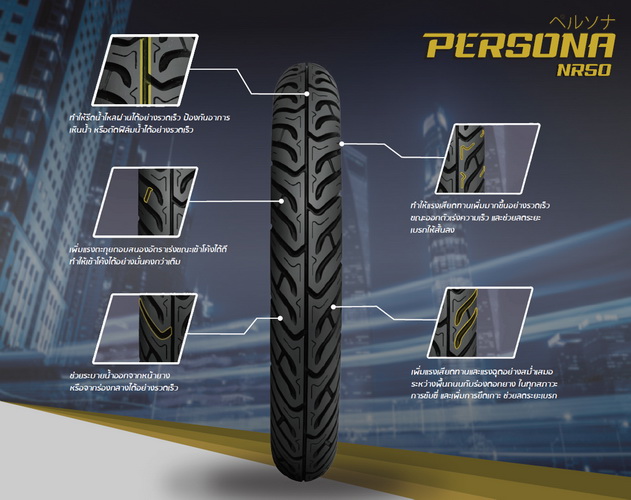 ทั้งนี้ยางรุ่น PERSONA NR50 เพิ่มศักยภาพในทุกมิติให้ตอบสนองการขับขี่ทุกรูปแบบ ไม่ว่าจะเป็นการขับขี่ในชีวิตประจำวัน, ท่องเที่ยว, ธุรกิจขนส่งสินค้า รวมถึงการขับขี่สัญจรในรูปแบบวินมอเตอร์ไซค์สาธารณะที่ต้องรองรับผู้โดยสารและใช้งานอย่างต่อเนื่องในตลอดวัน ด้วยคุณสมบัติของยางและลายดอกยางที่ถูกออกแบบอย่างพิถีพิถัน ให้อารมณ์ความสปอร์ตผสมผสานความดุดัน ลายดอกยางอเนกประสงค์ ร่องดอกยางมุมเอียง 45 องศา จากเซ็นเตอร์ถึงไหล่ยางเป็นแนวทแยงรอบเส้น ที่มีอัตราส่วนของร่องดอกยางที่มากขึ้น และมีความกว้างร่องมากกว่ายางทั่วไป โดยมีจุดประสงค์เพื่อการใช้งานทุกสภาพถนนอย่างแท้จริง โดยลายดอกยางถูกออกแบบเป็น 5 ส่วนด้วยกัน ดังนี้