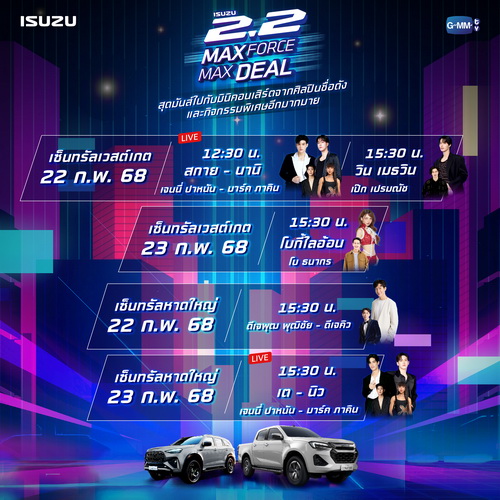 “Isuzu 2.2 MAXFORCE MAXDEAL โปรแรงสะใจ งานใหญ่สุดฟิน” พิเศษสำหรับลูกค้าจองรถปิกอัพ อีซูซุ ดีแมคซ์ และรถอเนกประสงค์ มิว-เอ็กซ์ ทุกรุ่น รับสิทธิ์ลุ้นรับรางวัลใหญ่ ทองคำหนัก 2 บาท จำนวน 22 รางวัล รวมมูลค่ากว่า 1,900,000 บาท นอกจากแคมเพจ์นพิเศษ ภายในงานยังจัดเต็มความบันเทิงจากศิลปิน ชื่อดังมากมาย อาทิเช่น วิน-เมธวิน โบกี้ไลอ้อน และดีเจพุฒ-พุฒิชัย พร้อมด้วยพิธีกรมากความสามารถ เป๊ก-เปรมณัช โบ-ธนากร และดีเจคิว พร้อมเพิ่มความสนุกกับกิจกรรม LIVE สุดฟิน สกาย-นานิ และ เต-นิว ที่จะมามอบความสุขและมอบโชคให้กับทุกคนพร้อมกันทั่วประเทศ โดยกิจกรรมจะจัดขึ้นในวันที่ 18 – 24 กุมภาพันธ์ 2568 ที่เซ็นทรัลหาดใหญ่ จ. สงขลา และ 19 – 25 กุมภาพันธ์ 2568 ที่เซ็นทรัลเวสต์เกต จ. นนทบุรี