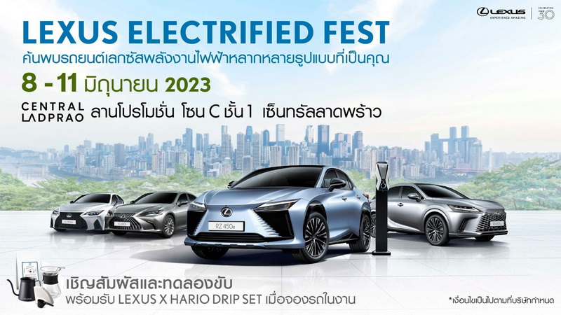 เชิญพบกับ Lexus Electrified Fest งานแสดงสุดยอดยนตรกรรมไฟฟ้า Lexus Electrified ที่จะไปให้คุณได้สัมผัสอย่างใกล้ชิดถึงใจกลางเมือง พร้อมทดลองขับ The All-Electric Lexus RZ และรถยนต์เลกซัสอีกหลากหลายรุ่น อาทิ RX NX ES IS และ UX พร้อมรับข้อเสนอสุดพิเศษ และของสมมนาคุณ Lexus x Hario Drip Set (มีจำนวนจำกัด) เมื่อจองรถภายในงาน พบกันที่โซน C ชั้น 1 เซ็นทรัลลาดพร้าว ตั้งแต่วันที่ 8 – 11 มิถุนายน ศกนี้