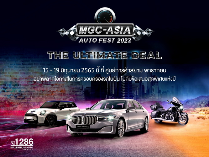 มิลเลนเนียม ออโต้ กรุ๊ป จัดเต็มในงาน เอ็มจีซี-เอเชีย ออโต้ เฟส 2022 กับหลากหลายยนตรกรรมระดับพรีเมียม ที่มาพร้อมข้อเสนอดีที่สุดแห่งปี ‘The Ultimate Deal’ ระหว่างวันที่ 15-19 มิถุนายนนี้ บริเวณลานแฟชั่นฮอลล์ ชั้น 1 และลานพาร์ค พารากอน ศูนย์การค้าสยามพารากอนนอกจากนั้นก็จะมีมินิคอนเสิร์ตจาก ‘แหนม รณเดชน์’ ในวันเสาร์ที่ 18 มิถุนายน และมินิคอนเสิร์ตจาก ‘อะตอม ชนกันต์’ รวมถึงเวิร์คช็อป จากเนสเพรสโซ ประเทศไทย ในวันที่ 19 มิถุนายน อีกด้วย