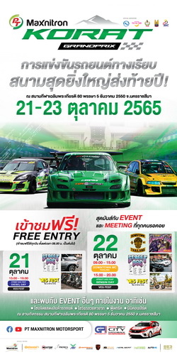 PT Maxnitron Racing Series 2022 พร้อมเปิดฉากสปีดความเร็วสนามสุดท้ายปิดฤดูกาล ในรูปแบบ “Street Circuit” ณ สนามกีฬาเฉลิมพระเกียรติ 80 พรรษา จังหวัดนครราชสีมา วันที่ 21-23 ตุลาคม 2565 โดยเปิดให้เข้าชมอย่างใกล้ชิดติดขอบสนามฟรี หรือชมการถ่ายทอดสดผ่านออนไลน์ผ่าน Facebook&Youtube PT Maxnitron Motorsport หวังยกระดับมาตรฐานการแข่งขันรถยนต์ทางเรียบไทยให้ทัดเทียมมาตรฐานสากล และกระตุ้นเศรษฐกิจการท่องเที่ยวส่งท้ายปี