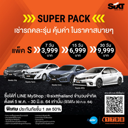 ยิ่งไปกว่านั้น ซิกท์ รถเช่า ก็เพิ่มความคุ้มค่าอีกระดับ โดยมอบส่วนลด 50% สำหรับการชำระค่าประกันภัยต่อวัน สำหรับแพ็กเกจการเช่าทั้งหมด ส่วนวันศุกร์ เสาร์ และอาทิตย์ มีค่าใช้จ่ายเพิ่ม 100 บาทต่อวัน ผู้สนใจสามารถซื้อคูปองผ่านแอพพลิเคชั่น LINE @ sixtthailand ในเมนู คูปองเช่ารถ LineMyshop หรือ โทร. 1798 ตั้งแต่วันนี้ ถึง 30 มิถุนายน 2564 และสามารถเช่ารถได้ถึงเดือนกันยายน 2564 (จำนวนจำกัด สงวนสิทธิ์สำหรับท่านที่จองก่อนในการเลือกรุ่นรถยนต์ที่เช่า)