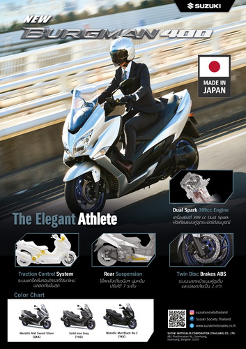Suzuki Burgman 400 มาพร้อมเครื่องยนต์ 399 cc Dual Spark หัวเทียนแบบคู่จุดระเบิดได้สมบูรณ์ระบบแทร็คชั่นคอนโทรลที่ใส่มาใหม่ปลอดภัยขั้นสุดโช๊คหลังเดี่ยว นุ่มหนึบ ปรับได้ถึง 7 ระดับระบบเบรกหน้าแบบดิสก์คู่ปลอดภัยเป็น 2 เท่า แถม Suzuki ยังใส่ระบบ Easy Start สตาร์ทได้ทันทีเพียงกดปุ่มในครั้งเดียวทำให้ Big Scooter คันนี้ตอบโจทย์ทุกการใช้งานอย่างแท้จริงสำหรับลูกค้าที่กำลังสนใจหรือมองหารถสักคันอยู่รับรองได้เลยว่า Burgman 400 คันนี้ไม่มีผิดหวังแน่นอน สำหรับท่านที่สนใจ Burgman 400 ราคา 239,000 บ.ผ่อนเริ่มต้นเพียง 3,695 บ./60เดือน พร้อมฟรี!! ประกันรถหาย + จดทะเบียน พ.ร.บ.