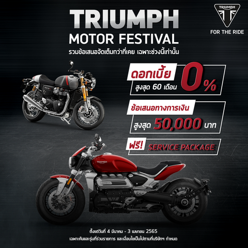 ไทรอัมพ์ มอเตอร์ไซเคิลส์ จัดหนักจัดจริง กับ Triumph Motor Festival Promotion ในโอกาสที่ไทรอัมพ์ มอเตอร์ไซเคิลส์ ฉลองครบรอบ 120 ปี ชวนไรเดอร์มาเป็นส่วนหนึ่งของครอบครัวไทรอัมพ์กับข้อเสนอทางการเงินที่อัดแน่น อาทิ รับดอกเบี้ย 0% นานสูงสุด 60 เดือน ข้อเสนอทางการเงินสูงสุด 50,000 บาท และประกันภัยชั้น 1 สำหรับรถจักรยานยนต์ในรุ่นและคันที่ได้รับสิทธิ์ภายใต้เงื่อนไขที่บริษัทที่กำหนด นอกจากนี้รถทุกรุ่นยังได้รับฟรี Triumph Service Packages โปรแกรมการดูแลค่าใช้จ่ายในการบำรุงรักษารถจักรยานยนต์สุดคุ้ม บริการช่วยเหลือฉุกเฉินบนท้องถนนตลอด 24 ชั่วโมง (Triumph Roadside Assistance) เป็นระยะเวลา 2 ปี และการรับประกันคุณภาพ Triumph Warranty สูงสุด 2 ปี มาร่วมเปิดประสบการณ์พิสูจน์สมรรถนะอันทรงพลังไปพร้อมกันได้ตั้งแต่วันที่ 4 มีนาคม – 3 เมษายน 2565